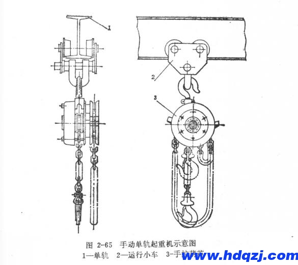 手拉葫蘆可以直接吊掛在固定物體上而作為定點(diǎn)吊掛的固定式使用,也可以配備運(yùn)行小車在單軌上手動(dòng)滑行而作為手動(dòng)單軌起重機(jī)使用。