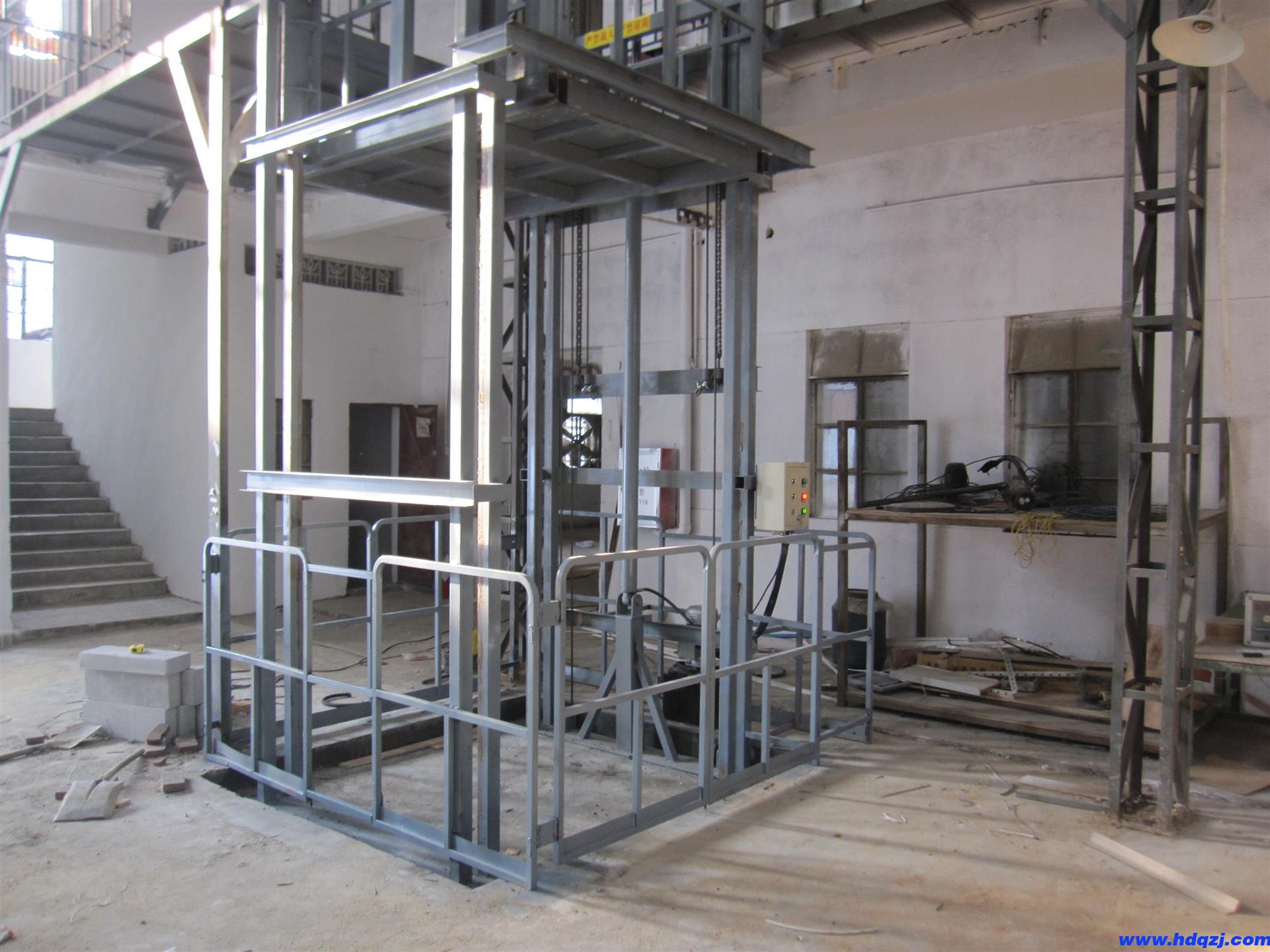 2、導軌式升降機,結(jié)構(gòu)為油缸直頂式,通過油缸的直線運行拉動傳動鏈條,帶動臺面的升降,完成作業(yè),導軌式升降機是近年來比較普及的一種貨梯形式,其優(yōu)點是升降高度比剪叉式升降機更高,運行穩(wěn)健,維護簡單等。